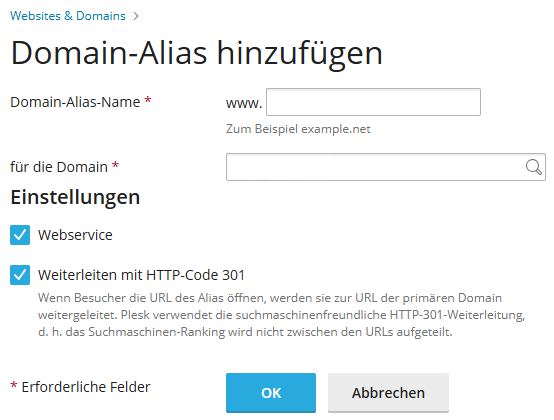 - Geben Sie nun den Domain-Alias-Namen ein und Ihre dazugehörige Domain.