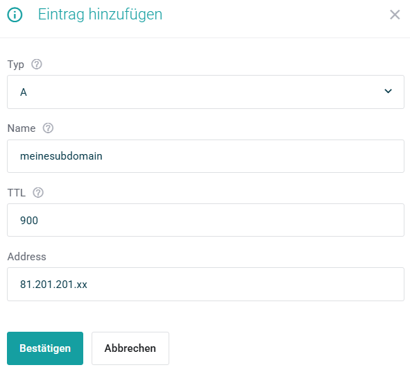 - Wert: Hinterlegen Sie die IP-Adresse des Hostservers. Typischerweise die gleiche IP wie beim www A- und @ A-Eintrag.