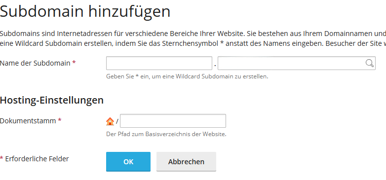 - Nun können Sie den Namen der Subdomain eingeben, sowie auch das Basisverzeichnis der Website.