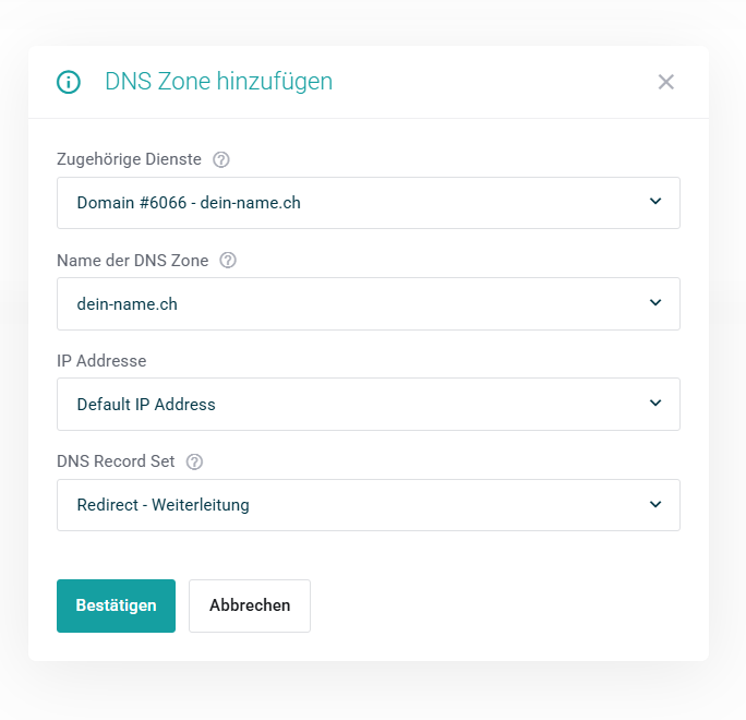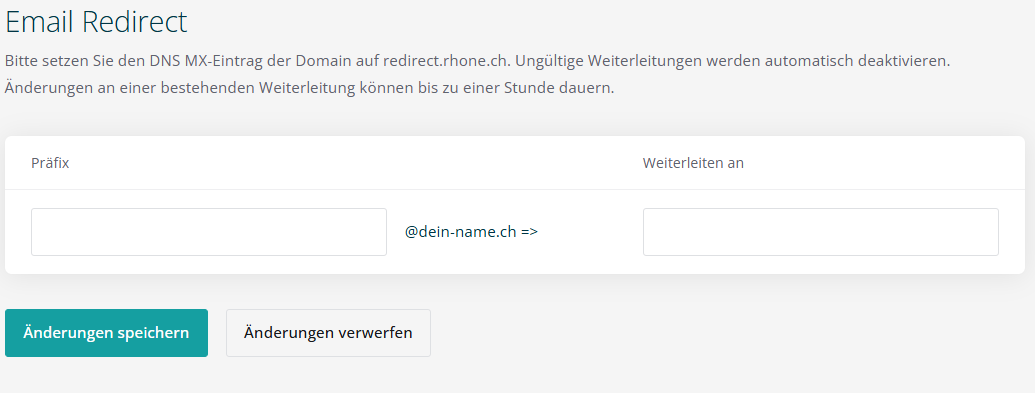 Name: @, Typ: MX, TTL: 86400, Wert: redirect.rhone.ch.