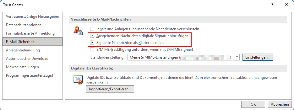 - In Outlook -> Datei -> Optionen -> Trust Center -> Einstellungen für das Trust Center -> E-Mail-Sicherheit
