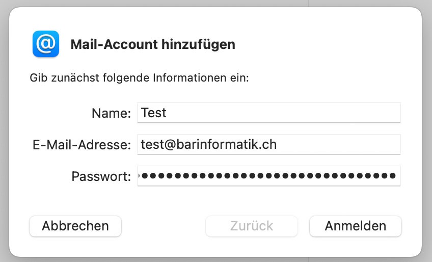 3. Im Fenster "Mail-Account hinzufügen" geben Sie Name, E-Mail-Adresse und Passwort ein und klicken auf "Anmelden"
