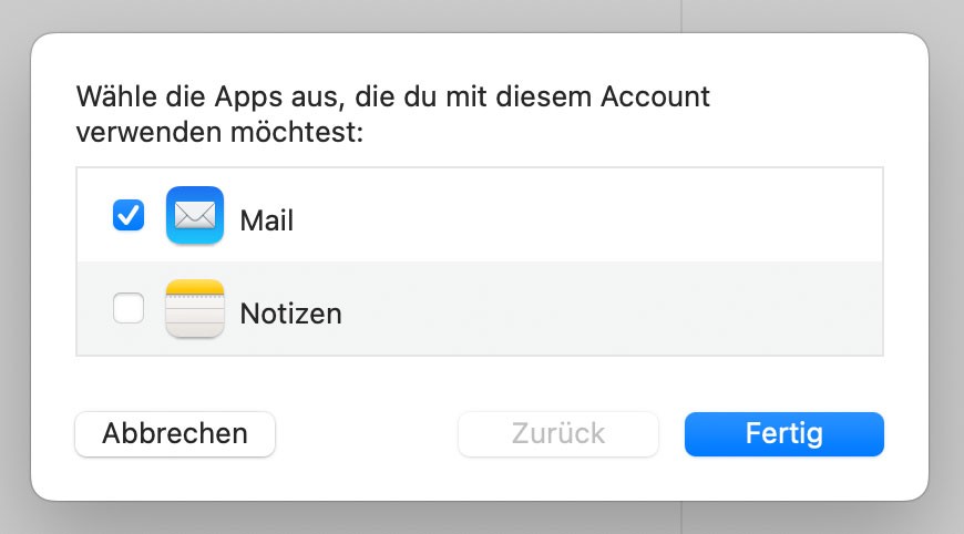 7. Im letzten Schritt wählen Sie, welche Apps mit dem Account synchronisiert werden sollen. Klicken Sie anschliessend auf "Fertig"